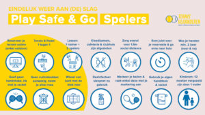 In deze eerste fase wordt alleen enkelspel of 1 trainer met max. 2 lesvolgers per terrein mogelijk, met uitzondering van families onder één dak. Voor iedereen gelden alle “Play Safe & Go” regels, die je hieronder terugvindt (versie voor spelers).